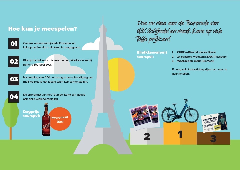 WV Schijndel Tourspel is een betaalde tourpool. Je kan er er een mooie prijs winnen zoals bijvoorbeeld een racefiets. Deze Tourpool is actief in 2025 . We weten niet precies hoe dit spel werkt. Deelname staat open voor iedereen.